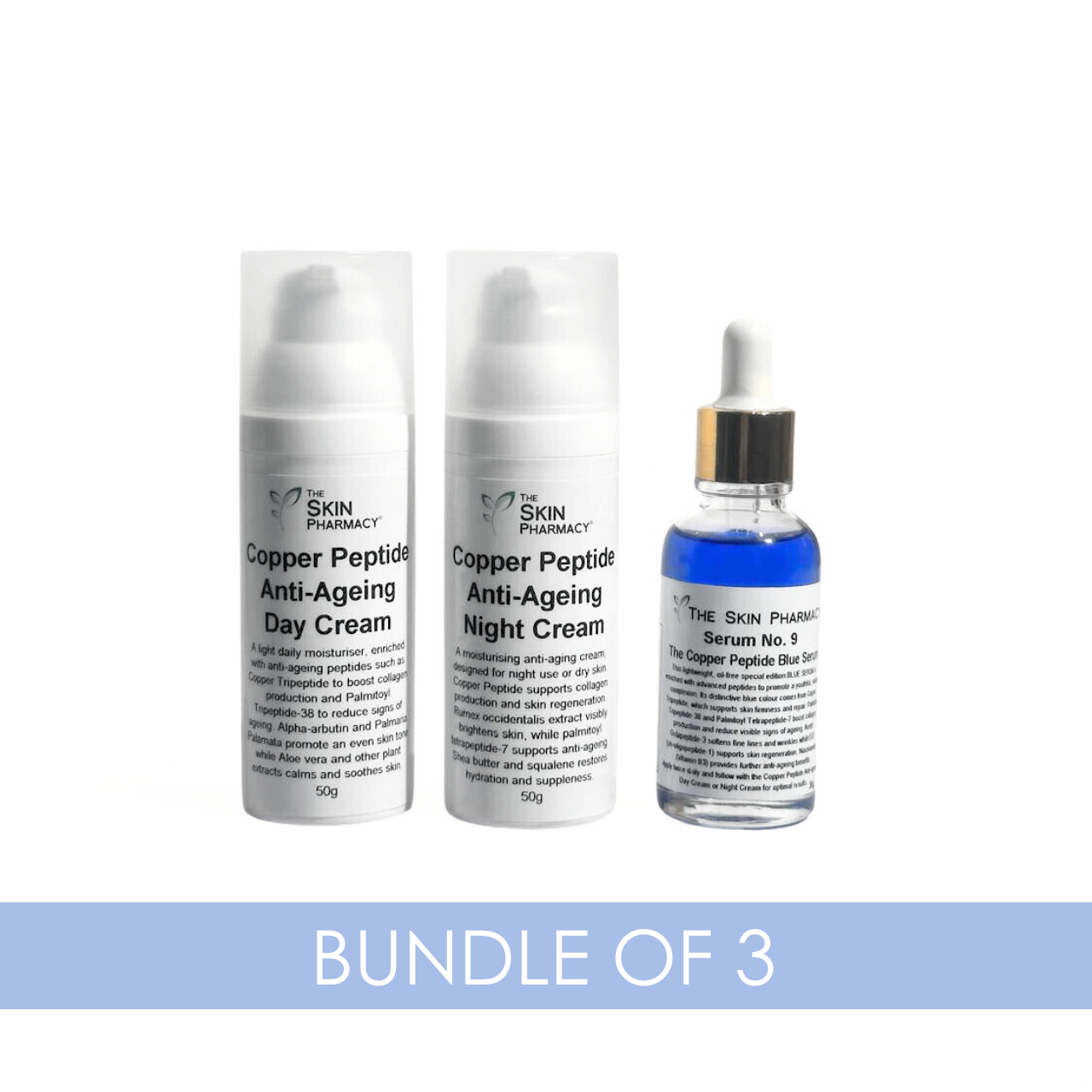 This set includes: Copper Peptide Anti-Ageing Day Cream, Copper Peptide Anti-Ageing Night Cream, and Serum No. 9 The Copper Peptide Blue Serum